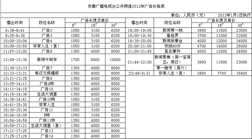 2012年安徽公共频道广告价格表