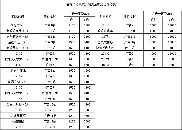 2012年安徽综艺频道广告价格表