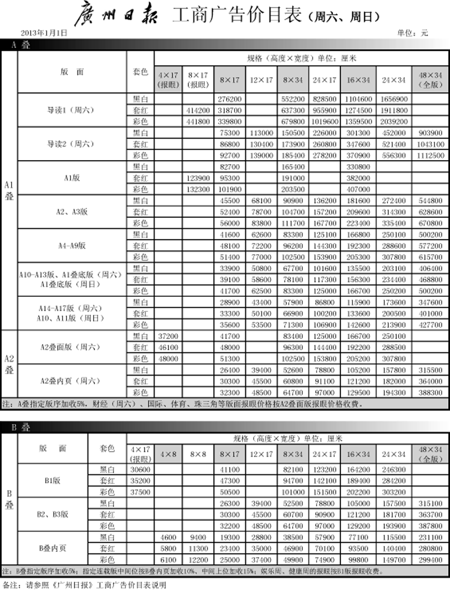 2013年广州日报工商广告价目表(周六周日)