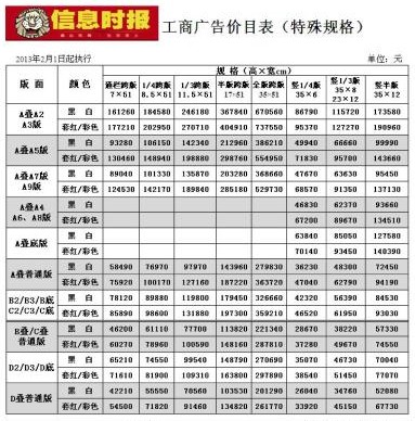信息时报2013版面刊例价 工商广告价目表(特殊规格)