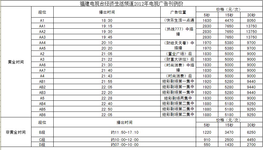 2012年福建经济生活频道广告价格表