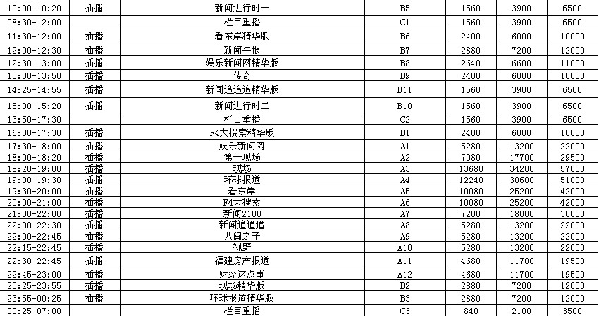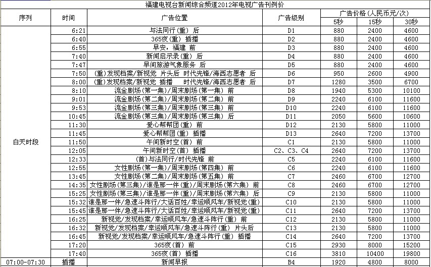 2012年福建综合频道广告价格表