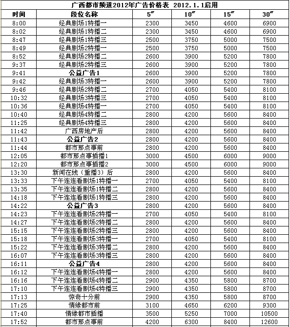 当前位置:主页 > 电视广告 > 广西 > 广西都市频道广告部 >