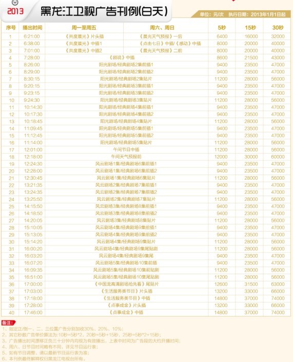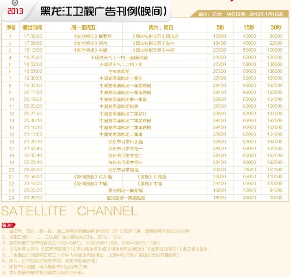 2013年黑龙江卫视广告刊例价