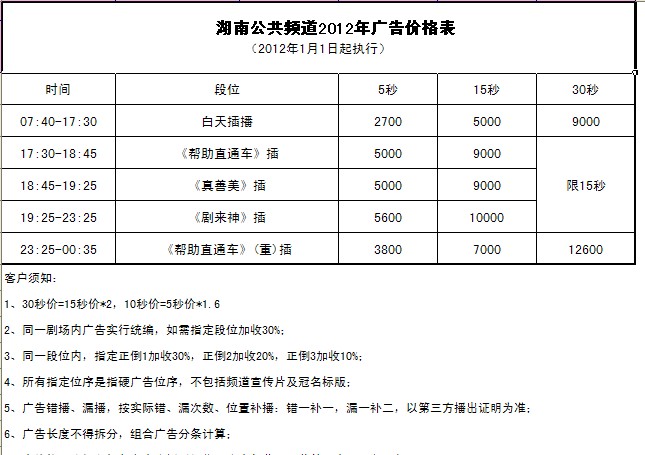 2012年湖南公共频道广告价格表