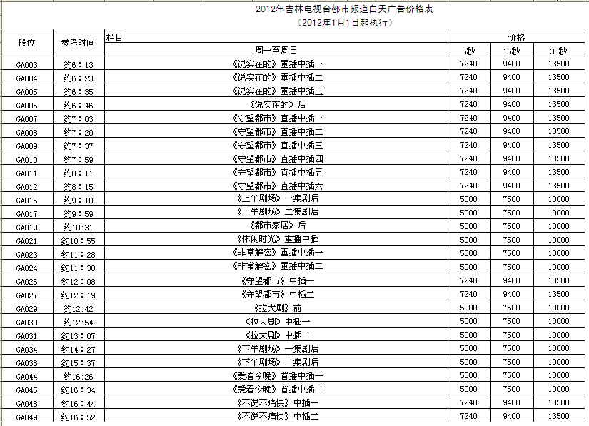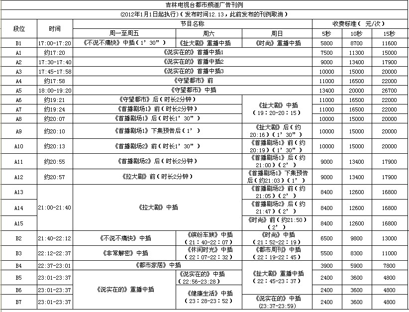 2012年吉林都市频道广告价格表