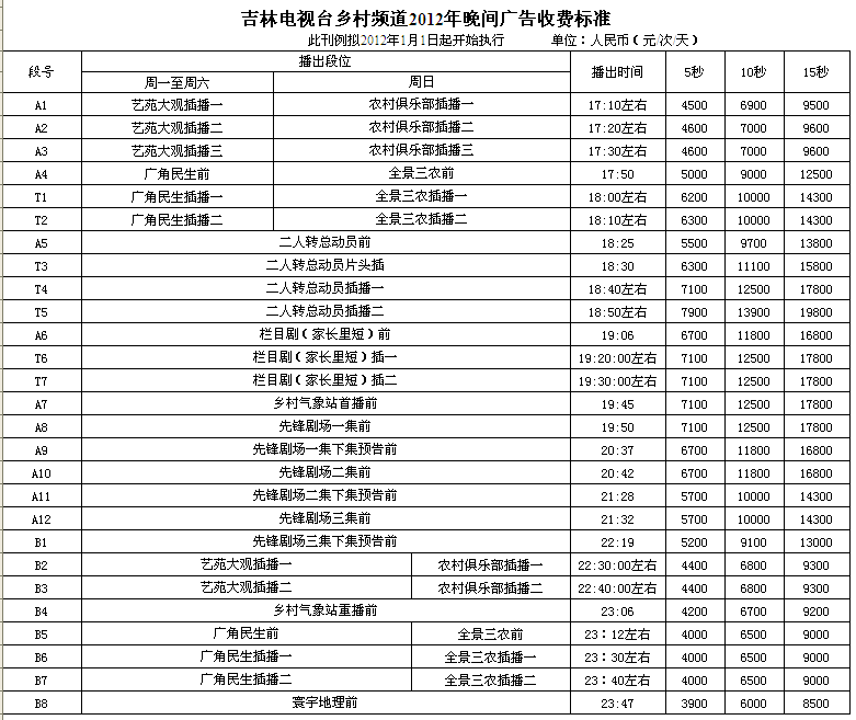 2012年吉林乡村频道广告价格