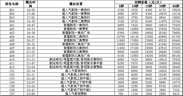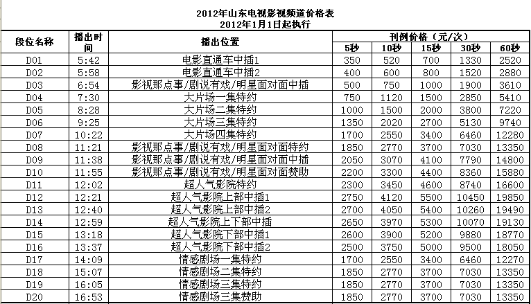 2012年山东影视频道广告价格表