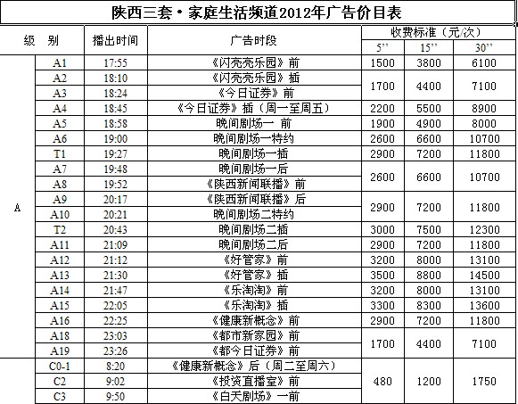 2012年陕西家庭生活频道广告价格表