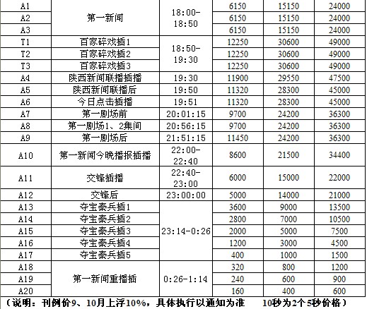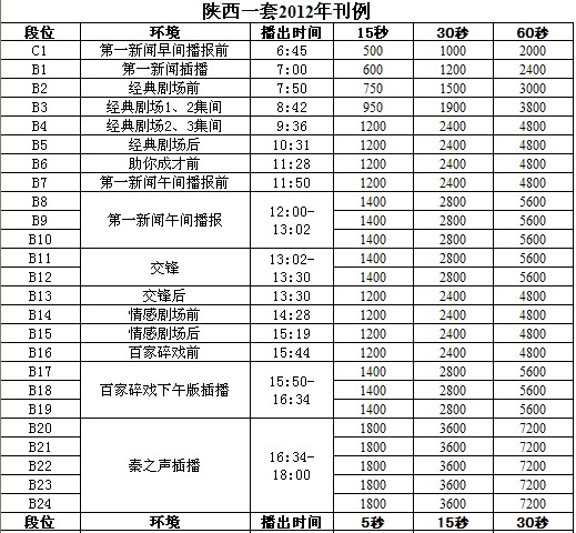 2012年陕西新闻综合频道广告价格表