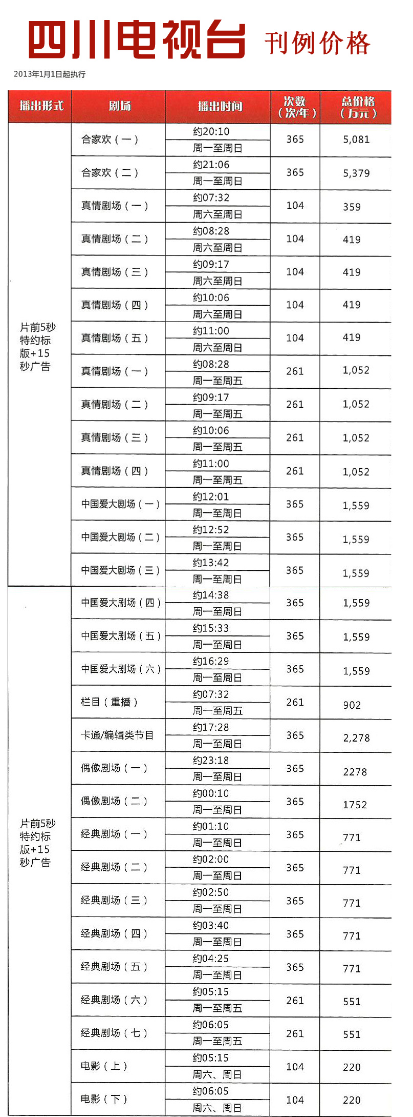 2013年四川卫视广告刊例价