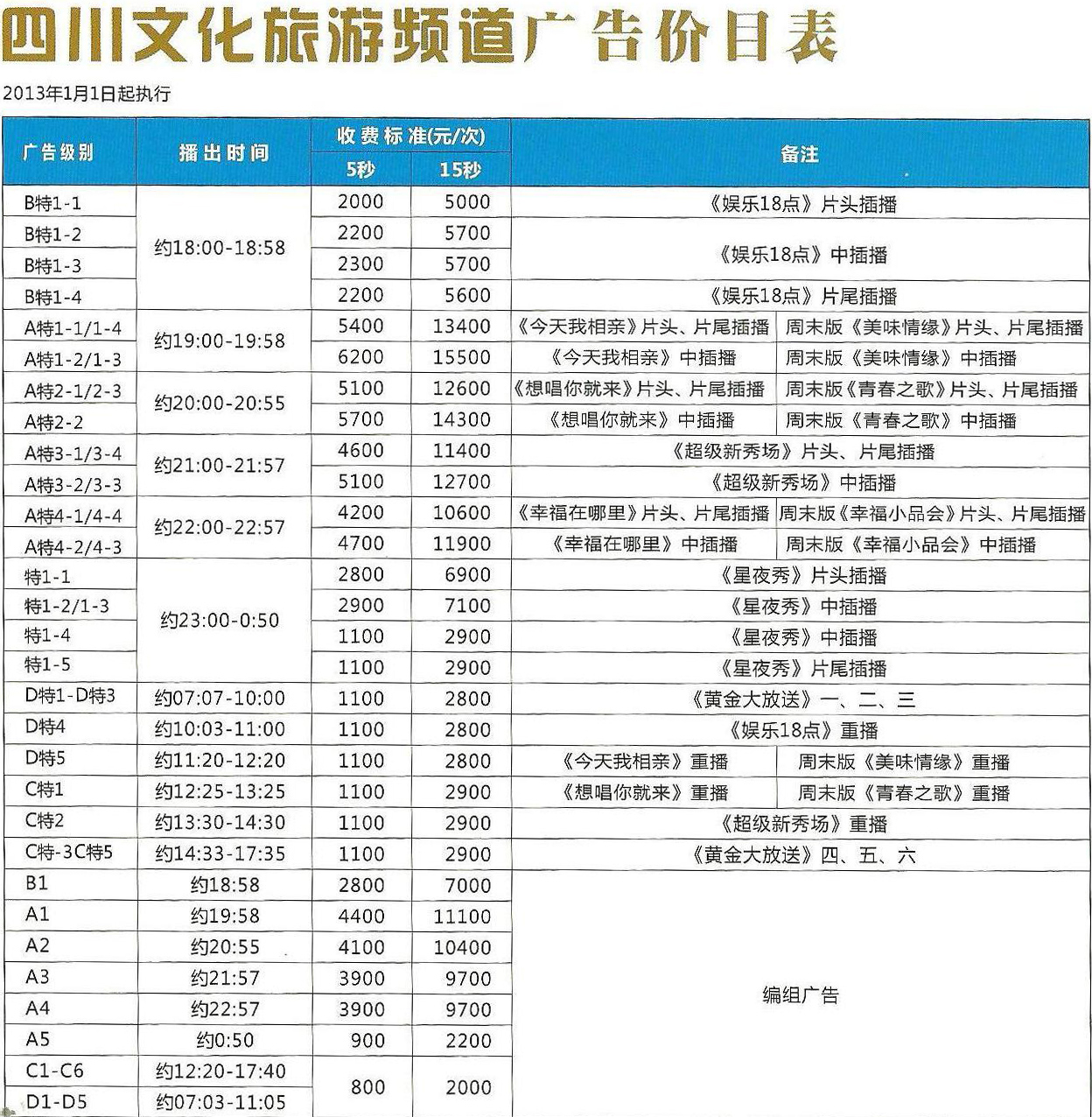 2013四川文化旅游频道广告刊例价