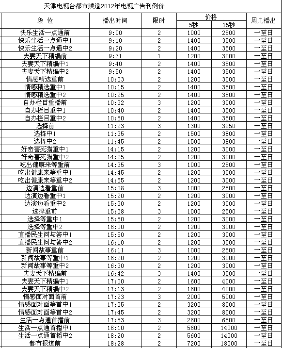 2012年天津都市频道广告价格表
