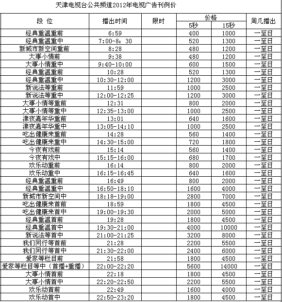 2012年天津公共频道广告价格表
