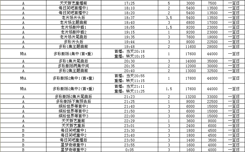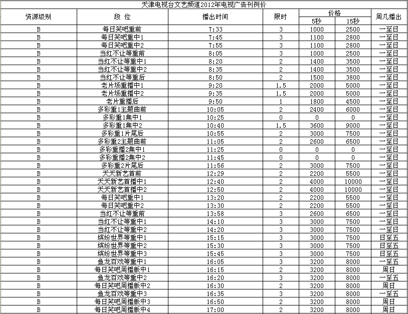 2012年天津文艺频道广告价格表