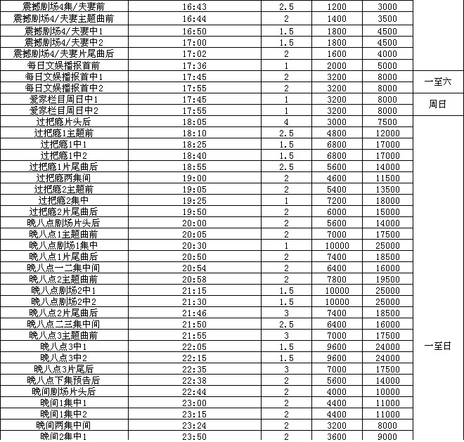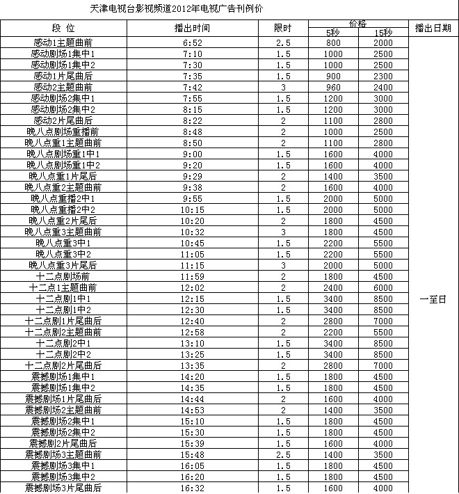 2012年天津影视频道广告价格表