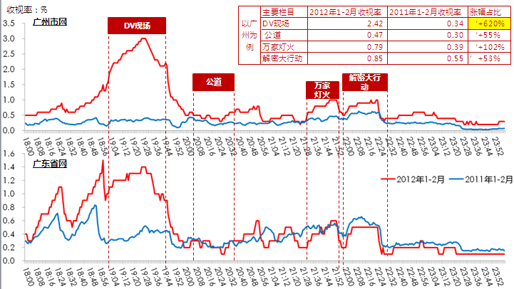 【广东公共频道电视节目收视率】从市版数据显示, 广东公共频道20121-2月收视VS2011年同期上涨明显,DV现场》,《开心剧场》,《万家灯火》,《解密大行动》等主要节目收视表现尤其突出。广东公共频道改版后收视率涨幅明显,尤其是主推项目《DV现场》收视率巨增。